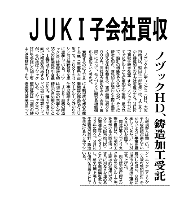 このたび、弊社がM&A仲介を務めましたノゾックホールディングスによるJUKIグループ子会社の株式取得の事例が日刊工業新聞へ取り上げられましたことをお知らせいたします。